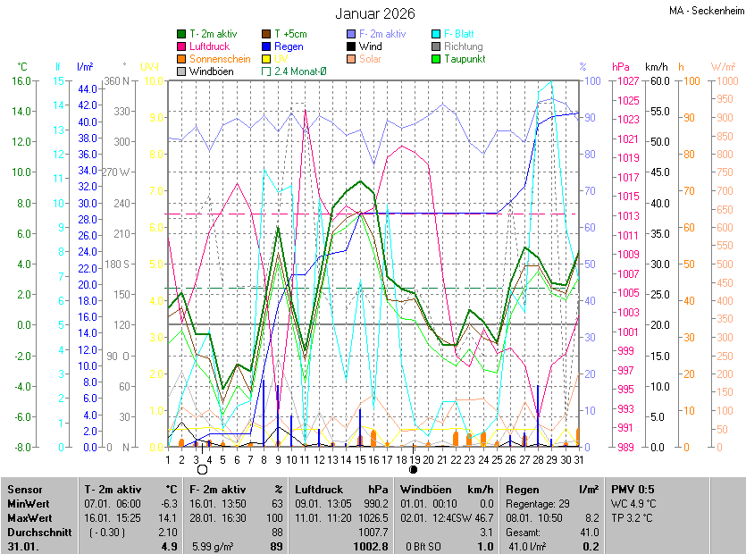 Die Durchschnittstemperatur für den Monat Januar 2026 lag bei 2.33°C. Die Abweichung vom langjährigen Mittel war -0.07°C.