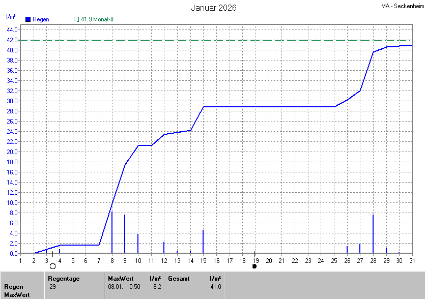 Die gesamte Regenmenge lag bei 28.8l/m² (entspricht: 68.7%) und war damit um -13.1l/m² vom langjährigen Wert entfernt. Niederschlag gab es an 9Tagen. Mehr als 2mm Regen gab es an 5Tagen. Sehr viel Regen mit mehr als 20mm pro Tag gab es an 0Tagen.