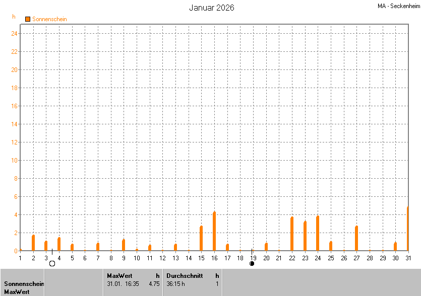 Dargestellt wird die grafische Übersicht für die Sonnenscheinzeit. Zu sehen sind immer die täglichen Sonnenstunden (von 0-24 Uhr):