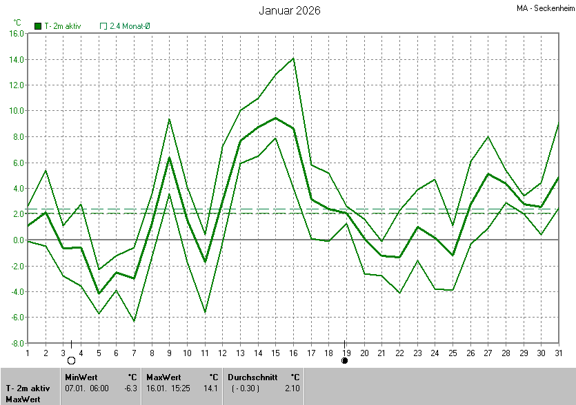 Der wärmste Tag war der 16.01.2026 um 15:25 mit 14.1°C. Am kältesten war es mit -6.3°C am 07.01.2026 um 06:00.