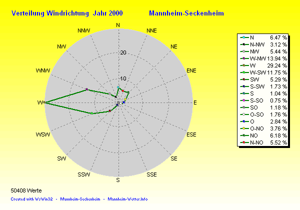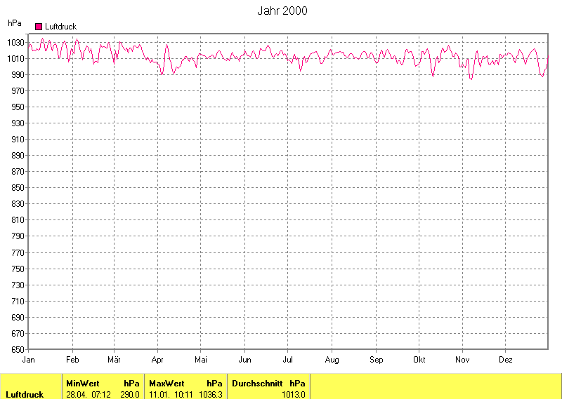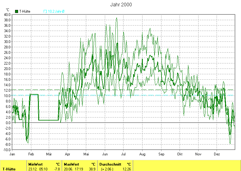 Die Durchschnittstemperatur für das Jahr 2000 lag bei 12,3°C. Die Abweichung vom langjährigen Mittel Betrug +2,06°C. Am wärmsten war es am 20.06.2000 um 17:19 mit 38,9°C. Am kältesten mit -7,8°C am 23.12.2000 um 05:10. An 6Tagen gab es Dauerfrost. An 20Tagen lag die Minimaltemperatur unter 0°C. Kalt, mit einer maximalen Temperatur unter 10°C war es an 92Tagen. Sommertage mit Temperaturen über 25°C gab es an 102Tagen und über 30°C wurden an 40Tagen erreicht. |