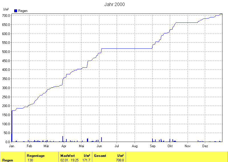 Die gesamte Regenmenge lag bei 708,8l/m² und war damit um +39,8l/m² vom langjährigen Wert entfernt. Niederschlag gab es an 130Tagen. Mehr als 2mm Regen gab es an 78Tagen. Sehr viel Regen mit mehr als 20mm pro Tag gab es an 3Tagen. |