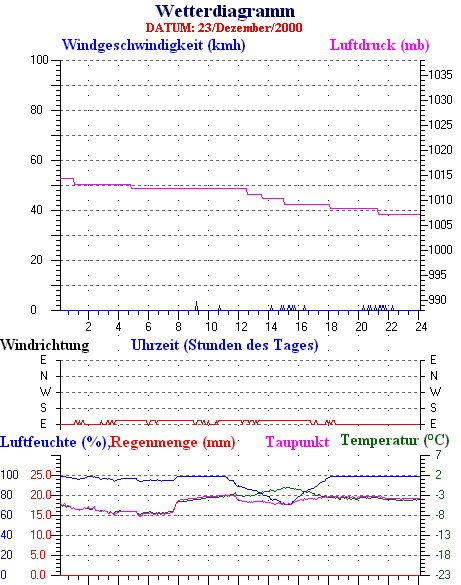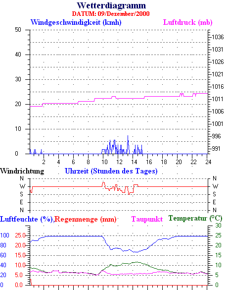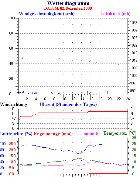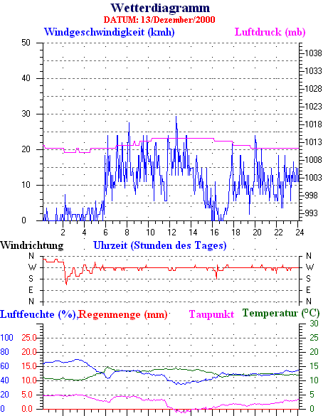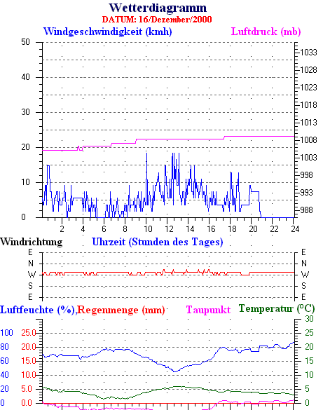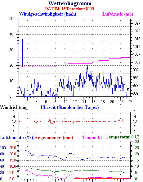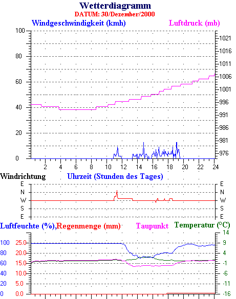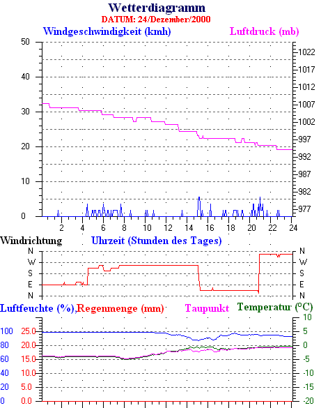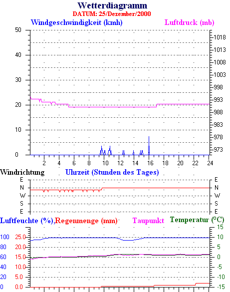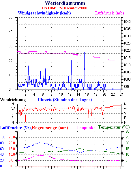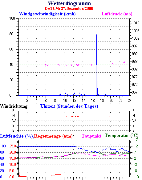 Durchschnitts- und Extremwerte Dezember bis 31/12/2000 --------------------------------------------------- Durchschnittstemperatur 5.1 °C Durchschnittl. Feuchtigkeit 84 % Durchschnittl. Taupunkt 2.4 °C Durchschnittl. Luftdruck 1008 mb Durchschnittl. Windgeschwindigkeit 2 kmh Durchschnittl. Windspitzen 0 kmh Durchschnittl. Windrichtung 280 ° Regenmenge diesen Monat 36 mm Regenmenge dieses Jahr 888 mm ----------------------------------------------------------- Max.Regenmenge pro Minute 0.0 mm am: 31 um 00:05 uhr Höchsttemperatur 15.3 °C am: 12 um 14:27 uhr Tiefsttemperatur -7.8 °C am: 23 um 05:13 uhr TiefstLuftdruck 985.0 hpa am: 27 um 15:35 uhr HöchstLuftdruck 1022.0 hpa am: 11 um 11:44 uhr Höchstes Windmittel 79.6 kmh aus 360° am: 27 um 16:45 uhr Höchster Hitzeindex 15.3 °C am: 12 um 14:27 uhr HöchstBoden= 0.3 °C TiefstBoden= 0.3 °C Pflanzenwachstum bei : 21.3 °C ------------------------------------------------------------ Tägl. Regenmenge 1 mm am: 2 2 mm am: 4 3 mm am: 8 5 mm am: 10 3 mm am: 17 5 mm am: 18 5 mm am: 19 2 mm am: 25 5 mm am: 25 4 mm am: 26 3 mm am: 27 ------------------------------------------------------------