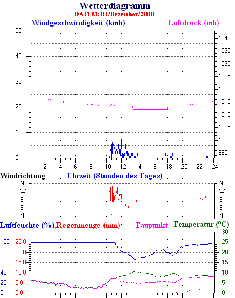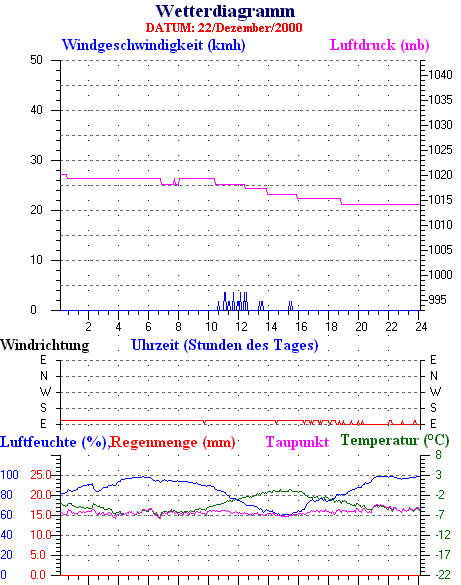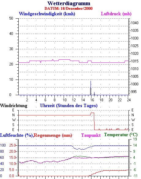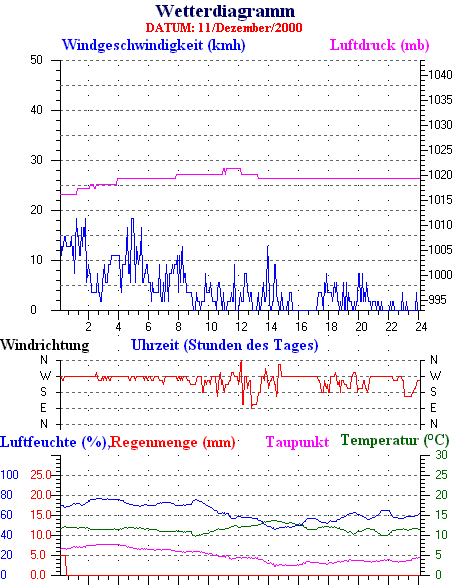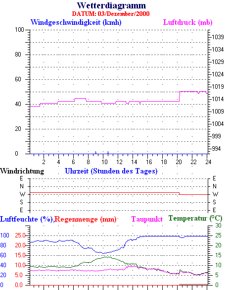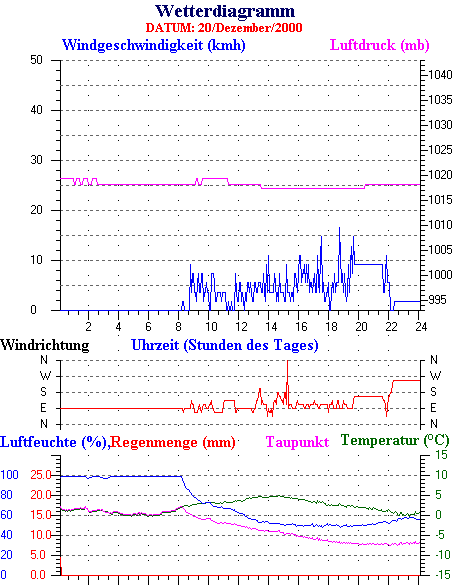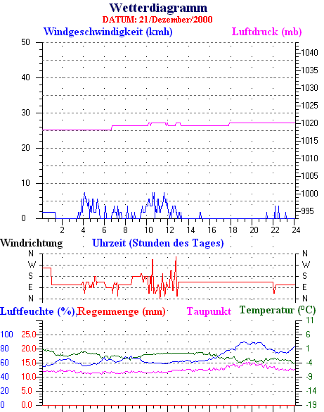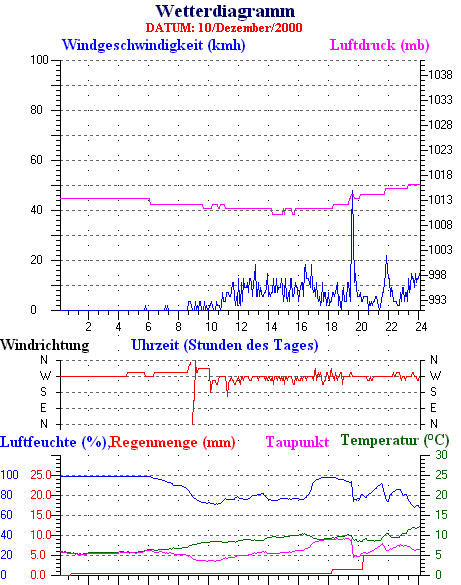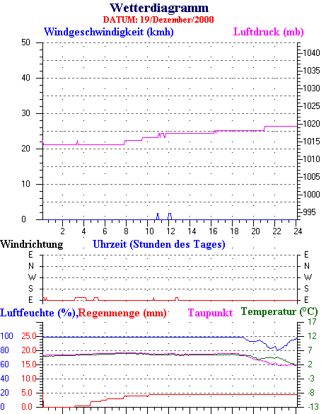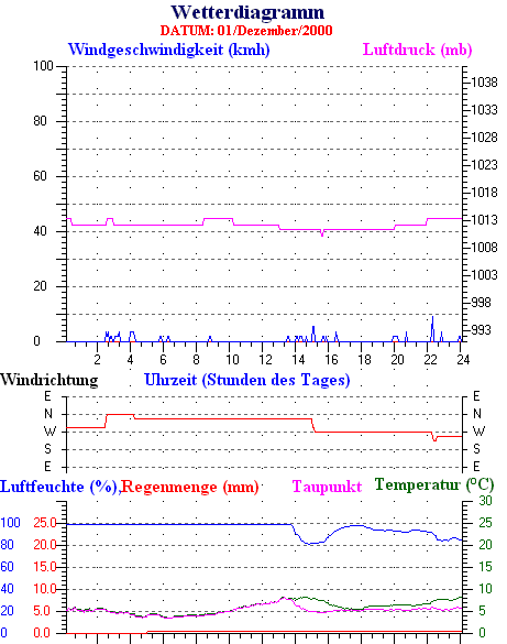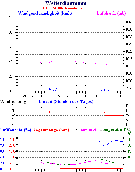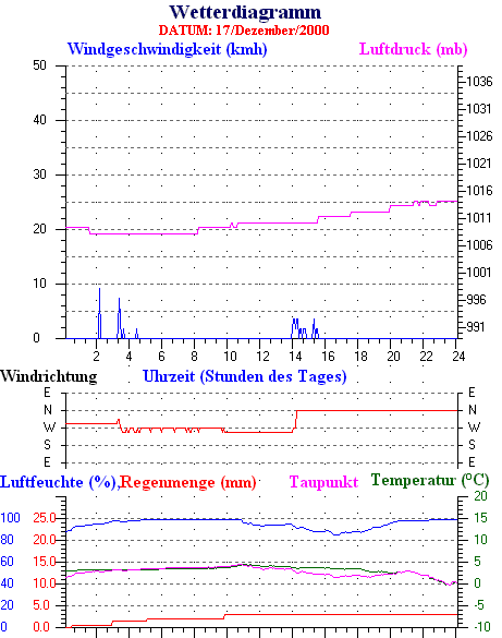 Durchschnitts- und Extremwerte Dezember bis 31/12/2000 --------------------------------------------------- Durchschnittstemperatur 5.1 °C Durchschnittl. Feuchtigkeit 84 % Durchschnittl. Taupunkt 2.4 °C Durchschnittl. Luftdruck 1008 mb Durchschnittl. Windgeschwindigkeit 2 kmh Durchschnittl. Windspitzen 0 kmh Durchschnittl. Windrichtung 280 ° Regenmenge diesen Monat 36 mm Regenmenge dieses Jahr 888 mm ----------------------------------------------------------- Max.Regenmenge pro Minute 0.0 mm am: 31 um 00:05 uhr Höchsttemperatur 15.3 °C am: 12 um 14:27 uhr Tiefsttemperatur -7.8 °C am: 23 um 05:13 uhr TiefstLuftdruck 985.0 hpa am: 27 um 15:35 uhr HöchstLuftdruck 1022.0 hpa am: 11 um 11:44 uhr Höchstes Windmittel 79.6 kmh aus 360° am: 27 um 16:45 uhr Höchster Hitzeindex 15.3 °C am: 12 um 14:27 uhr HöchstBoden= 0.3 °C TiefstBoden= 0.3 °C Pflanzenwachstum bei : 21.3 °C ------------------------------------------------------------ Tägl. Regenmenge 1 mm am: 2 2 mm am: 4 3 mm am: 8 5 mm am: 10 3 mm am: 17 5 mm am: 18 5 mm am: 19 2 mm am: 25 5 mm am: 25 4 mm am: 26 3 mm am: 27 ------------------------------------------------------------