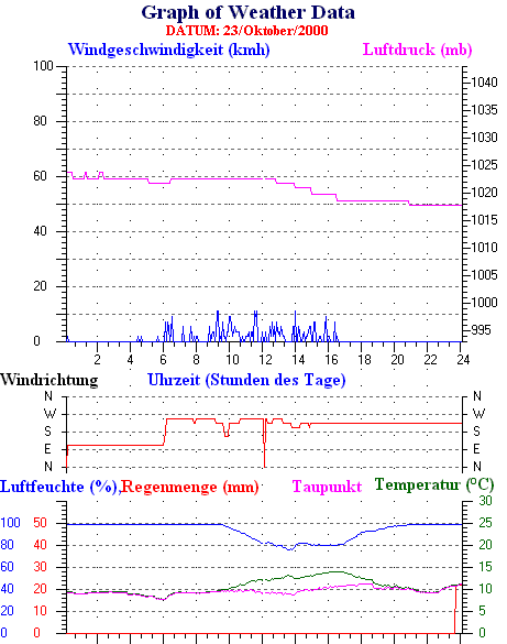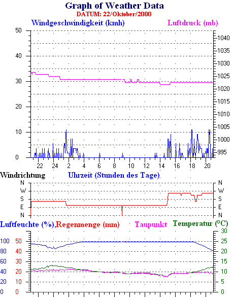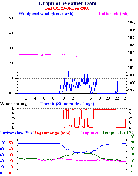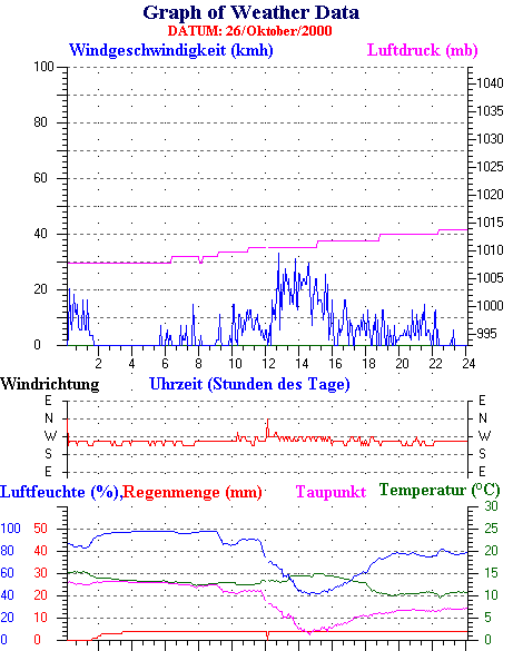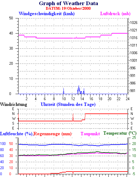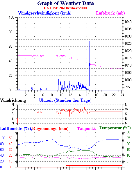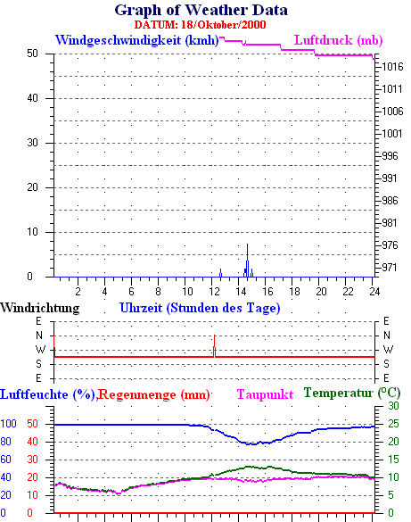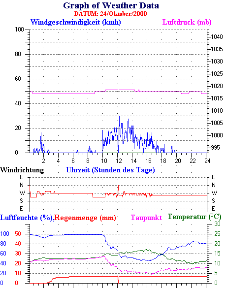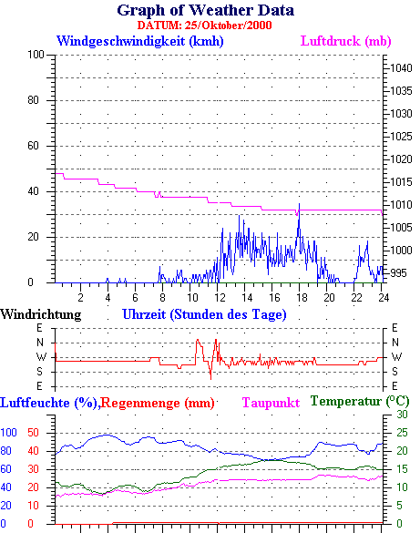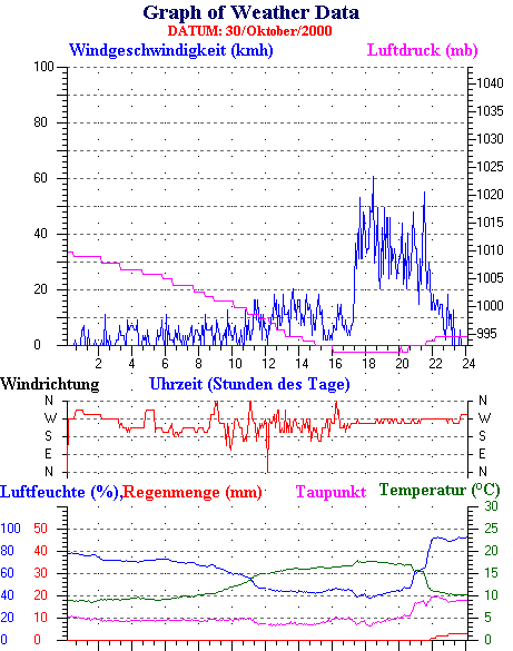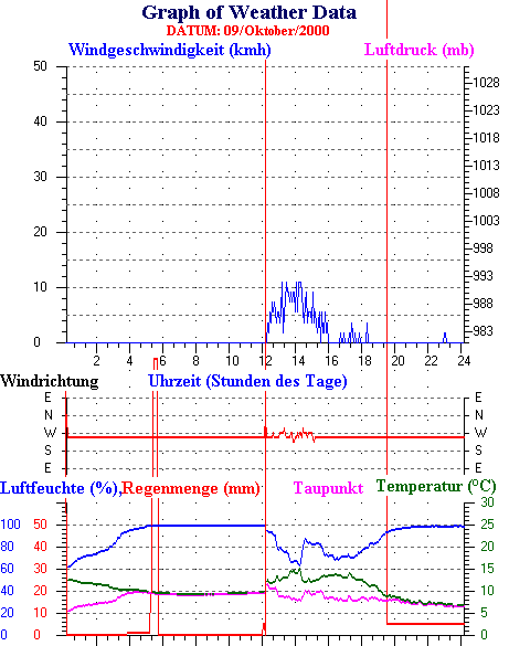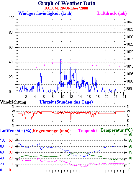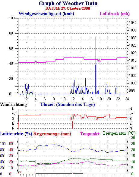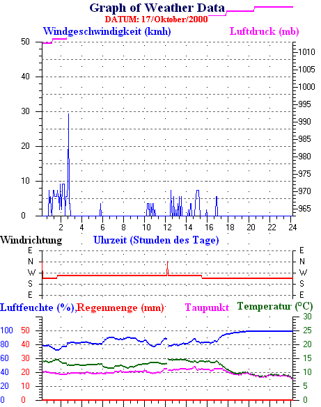 Durchschnitts- und Extremwerte Oktober to 31/10/2000 --------------------------------------------------- Durchschnittstemperatur 12.1 °C Durchschnittl. Feuchtigkeit 86 % Durchschnittl. Taupunkt 9.5 °C Durchschnittl. Luftdruck 1012 hpa Durchschnittl. Windgeschwindigkeit 2 kmh Durchschnittl. Windspitzenn 0 kmh Durschschnittl. Windrichtung 250 ° Regenmenge diesen Monat 80 mm Regenmenge dieses Jahr 770 mm ----------------------------------------------------------- Max.Regenmenge pro Minute 0 mm tag 31 zeit 00:05 Höchsttemperatur 21.3 °C tag 15 zeit 16:30 Tiefsttemperatur 2.6 °C tag 08 zeit 07:28 Höchstes Windmittel 77.7 kmh from 270 tag 16 zeit 03:40 Höchstes Hitzeindex 26.2 °C tag 03 zeit 16:35 Growing degrees days= 251.9 °C ------------------------------------------------------------ Daily rain totals 16 mm on day 1 14 mm on day 6 5 mm on day 9 6 mm on day 10 6 mm on day 11 2 mm on day 12 1 mm on day 13 4 mm on day 19 22 mm on day 23 7 mm on day 24 1 mm on day 25 4 mm on day 26 2 mm on day 27 3 mm on day 28 3 mm on day 30 ------------------------------------------------------------
