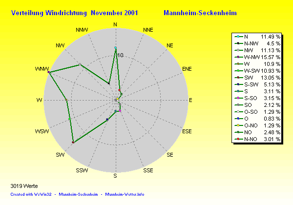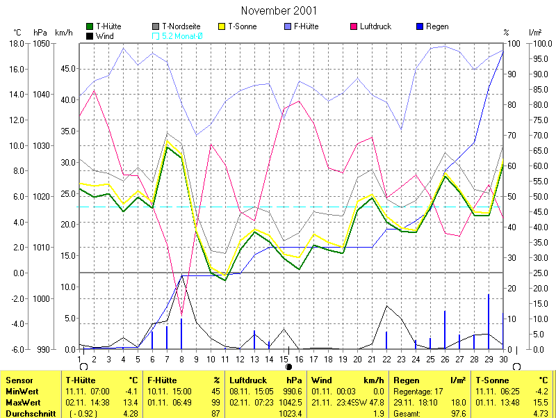 Die Durchschnittstemperatur für den Monat November 2001 lag bei 4.28°C. Die Abweichung vom langjährigen Mittel war -0.92°C.