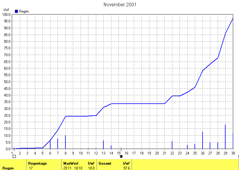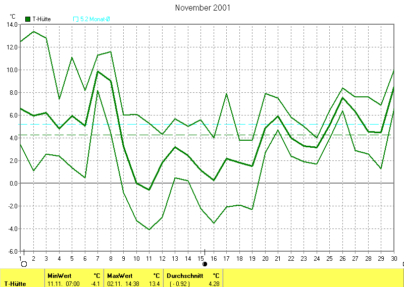 Der wärmste Tag war der 02.11.2001 um 14:38 mit 13.4°C. Am kältesten war es mit -4.1°C am 11.11.2001 um 07:00.