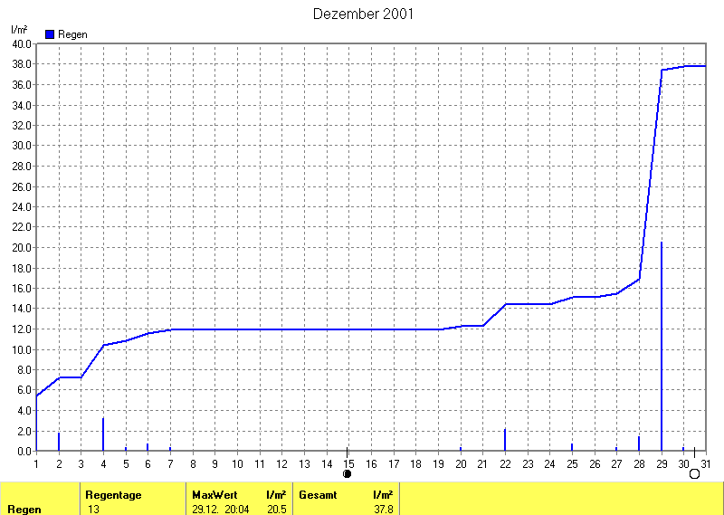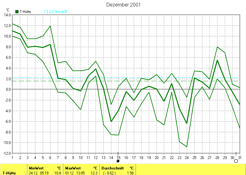 Der wärmste Tag war der 01.12.2001 um 13:05 mit 12.3°C. Am kältesten war es mit -10.8°C am 24.12.2001 um 05:19.