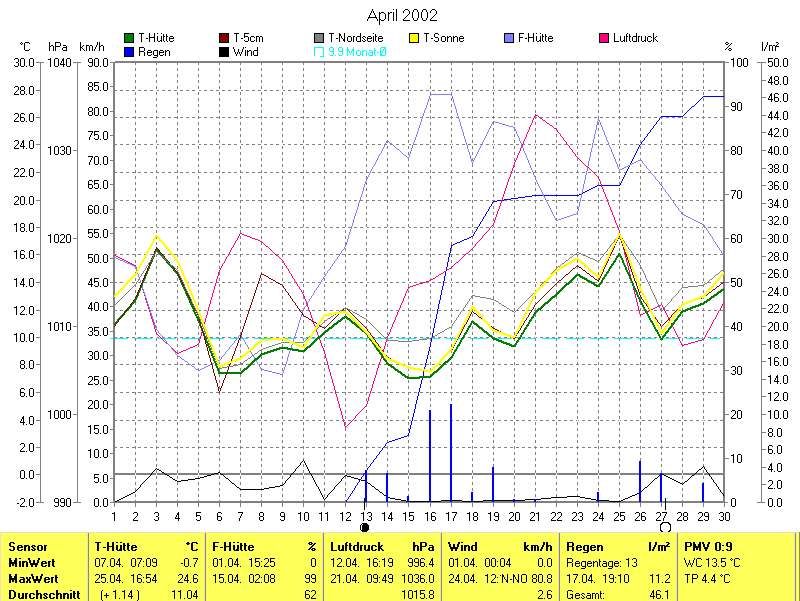 Die Durchschnittstemperatur für den Monat April 2002 lag bei 11.03°C. Die Abweichung vom langjährigen Mittel war +1.13°C.