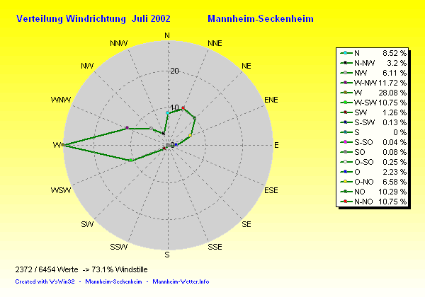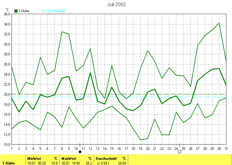 Der wärmste Tag war der 30.07.2002 um 16:50 mit 34.2°C. Am kältesten war es mit 10.9°C am 19.07.2002 um 05:20.