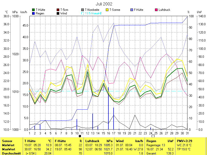 Die Durchschnittstemperatur für den Monat Juli 2002 lag bei 19.95°C. Die Abweichung vom langjährigen Mittel war +0.45°C.