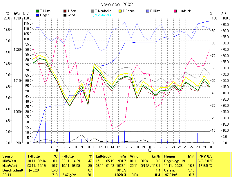 Der wärmste Tag war der 03.11.2002 um 14:19 mit 16.7°C. Am kältesten war es mit -0.1°C am 10.11.2002 um 07:34.
