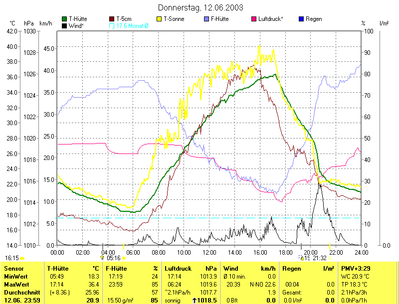 Schön zu erkennen ist das ab 17:30 Uhr die Wolken aufkamen. Aber zu mehr als ein paar Tropfen reichte es nicht. In der Umgebung gab es aber zum Teil heftige Gewitter.