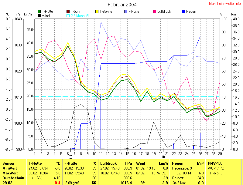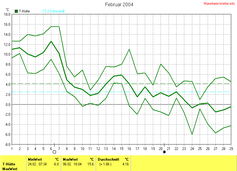 Die Durchschnittstemperatur für den Monat Februar 2004 lag bei 4.16°C. Die Abweichung vom langjährigen Mittel war +1.66°C.