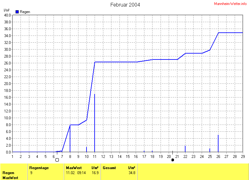 Der wärmste Tag war der 06.02.2004 um 16:04 mit 15.6°C. Am kältesten war es mit -6.0°C am 24.02.2004 um 07:34.