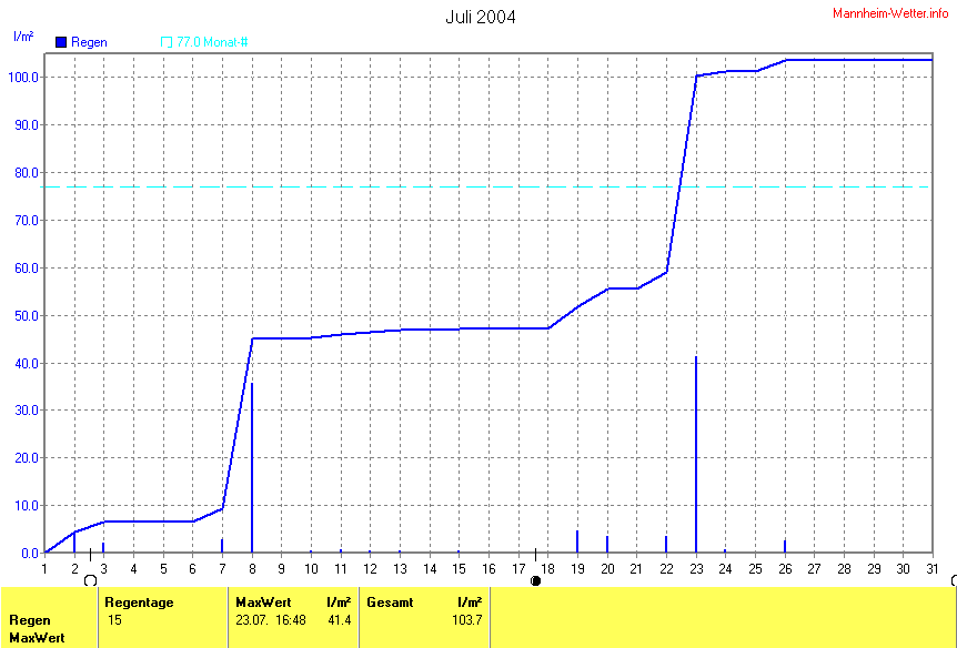 Die Durchschnittstemperatur für den Monat Juli 2004 lag bei 20.14°C. Die Abweichung vom langjährigen Mittel war +0.64°C.