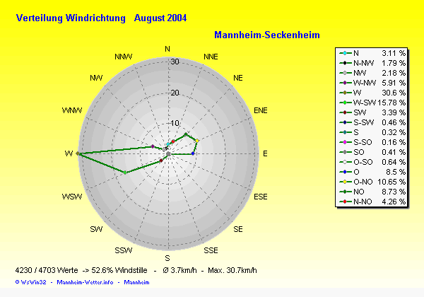 Die Durchschnittstemperatur für den Monat August 2004 lag bei 20.84°C. Die Abweichung vom langjährigen Mittel war +2.04°C.