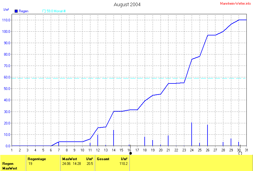 Die gesamte Regenmenge lag bei 110.2l/m² (entspricht: 186.8%) und war damit um +51.2l/m² vom langjährigen Wert entfernt. Niederschlag gab es an 19Tagen. Mehr als 2mm Regen gab es an 13Tagen. Sehr viel Regen mit mehr als 20mm pro Tag gab es an 1Tagen.