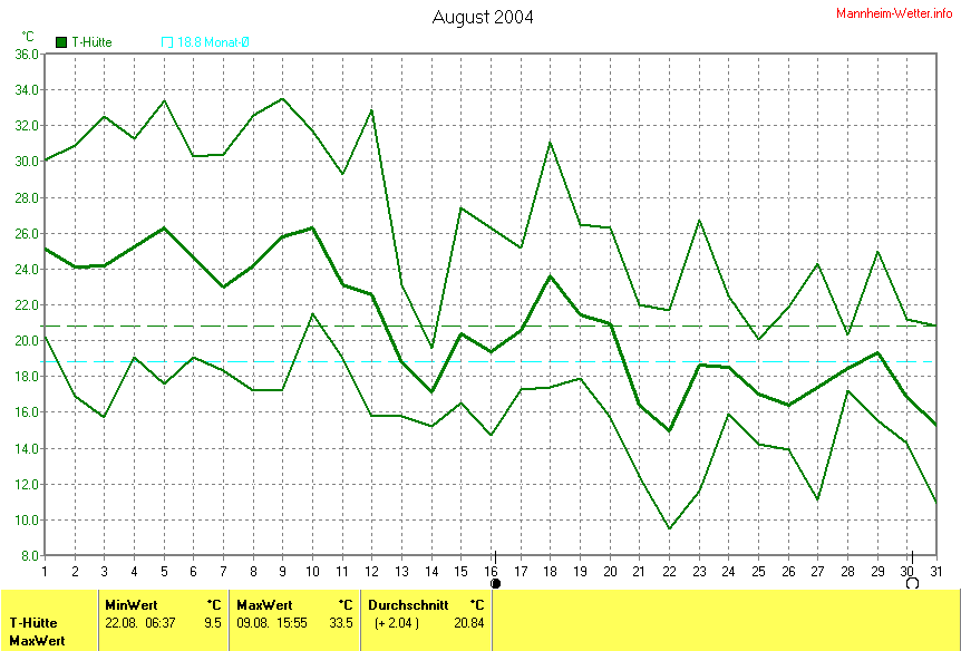 Der wärmste Tag war der 09.08.2004 um 15:55 mit 33.5°C. Am kältesten war es mit 9.5°C am 22.08.2004 um 06:37.