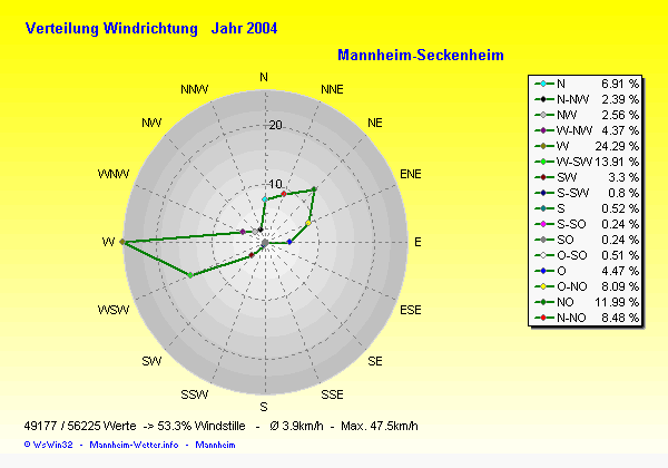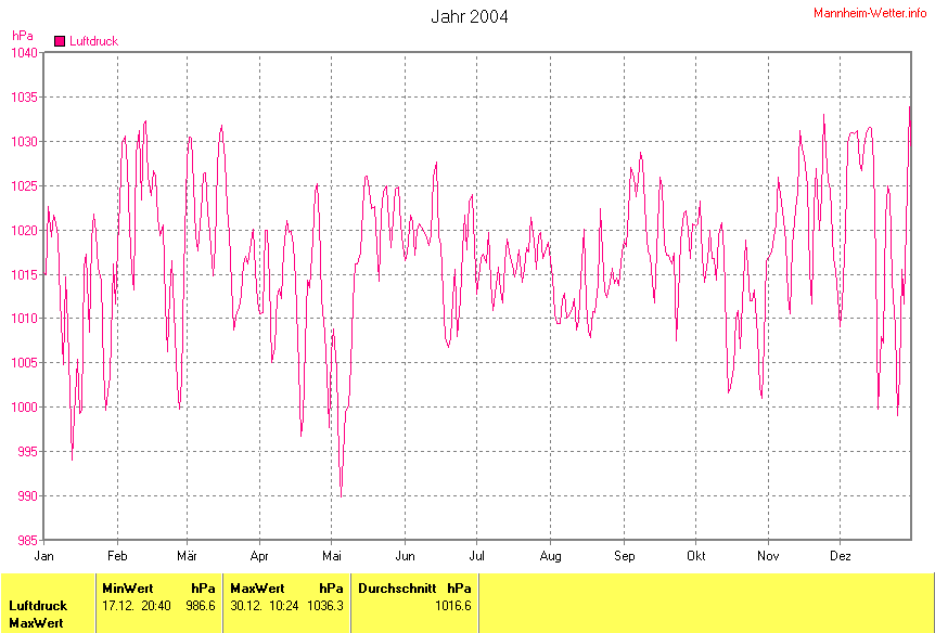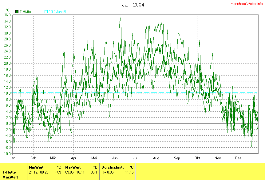 Die Durchschnittstemperatur für das Jahr 2004 lag bei 11.16°C. Die Abweichung vom langjährigen Mittel war +0.96°C.