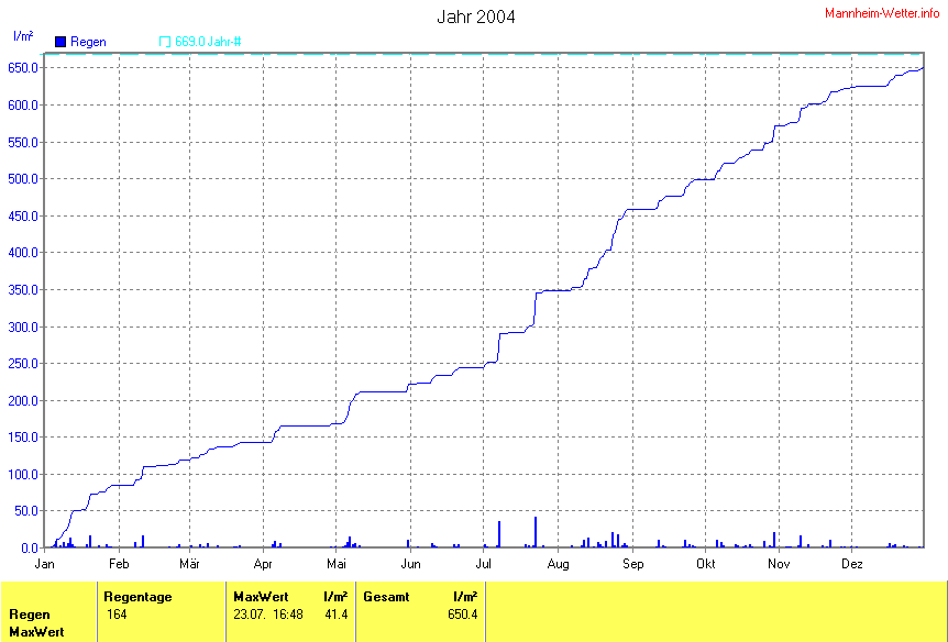 Die gesamte Regenmenge lag bei 650.4l/m² ( 97.2%) und war damit um -18.6l/m² vom langjährigen Wert entfernt. Niederschlag gab es an 164Tagen. Mehr als 2mm Regen gab es an 84Tagen. Sehr viel Regen mit mehr als 20mm pro Tag gab es an 4Tagen.