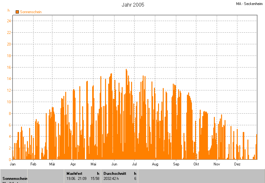 Dargestellt wird die grafische Übersicht für die Sonnenscheinzeit. Zu sehen sind immer die täglichen Zeiten (von 0-24 Uhr):