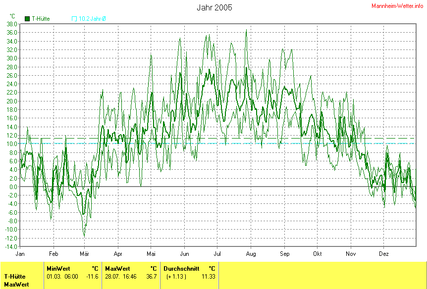 Die Durchschnittstemperatur für das Jahr 2005 lag bei 11.33°C. Die Abweichung vom langjährigen Mittel war +1.13°C.