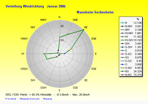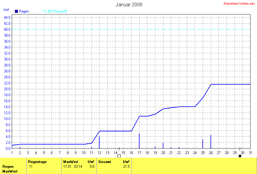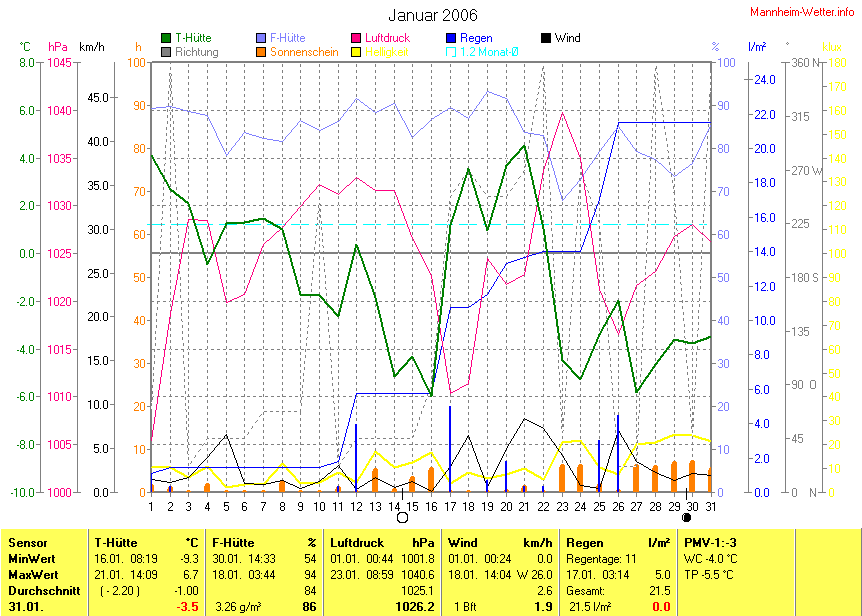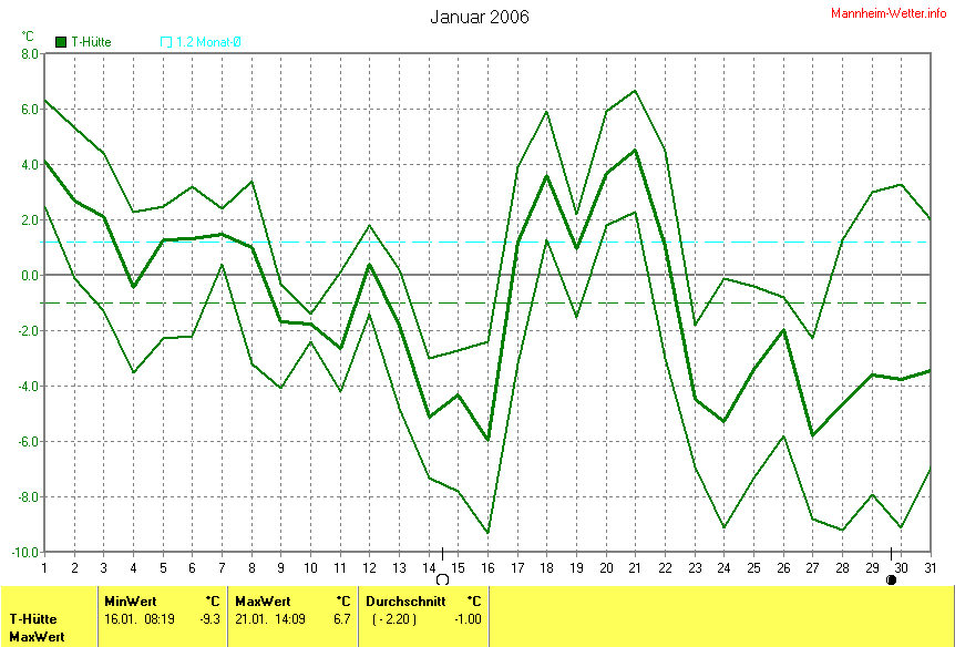 Der wärmste Tag war der 21.01.2006 um 14:09 mit 6.7°C. Am kältesten war es mit -9.3°C am 16.01.2006 um 08:19.