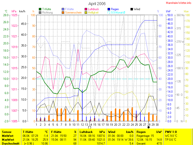 Der wärmste Tag war der 21.04.2006 um 16:25 mit 25.9°C. Am kältesten war es mit -1.4°C am 06.04.2006 um 07:29.