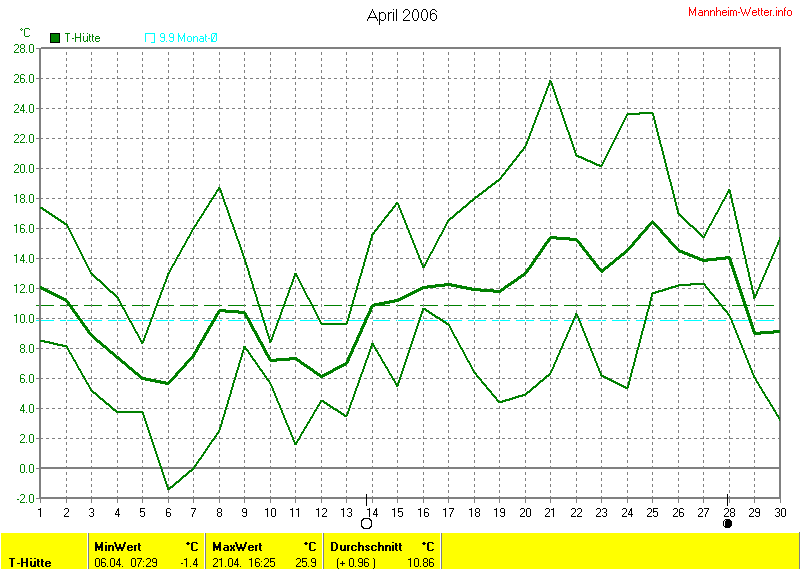 Die Durchschnittstemperatur für den Monat April 2006 lag bei 10.86°C. Die Abweichung vom langjährigen Mittel war +0.96°C.