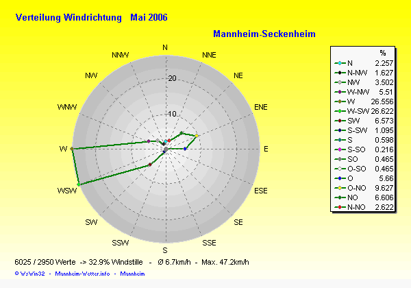 Die Durchschnittstemperatur für den Monat Mai 2006 lag bei 16.03°C. Die Abweichung vom langjährigen Mittel war +1.63°C.