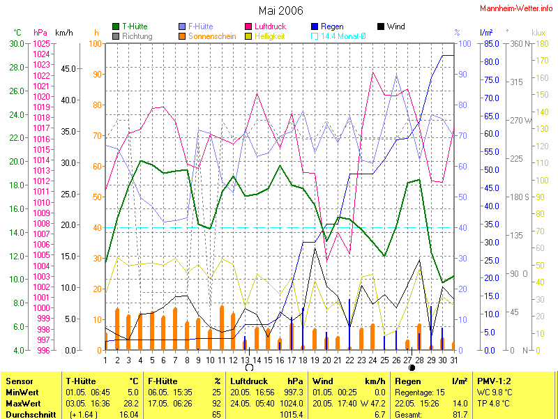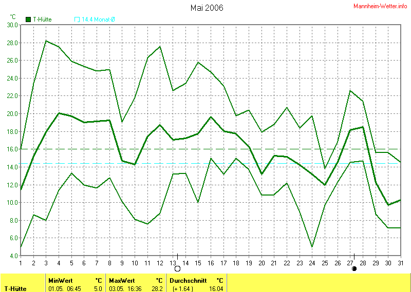 Der wärmste Tag war der 03.05.2006 um 16:36 mit 28.2°C. Am kältesten war es mit 5.0°C am 01.05.2006 um 06:45.