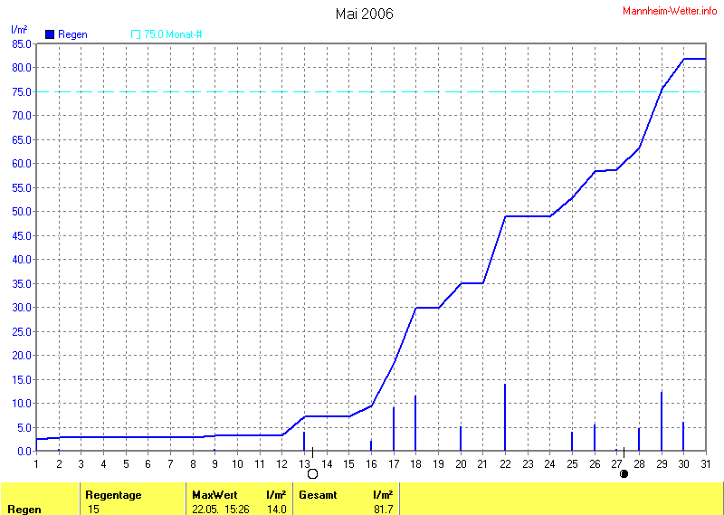 Die gesamte Regenmenge lag bei 81.7l/m² (entspricht: 109.0%) und war damit um +6.7l/m² vom langjährigen Wert entfernt. Niederschlag gab es an 15Tagen. Mehr als 2mm Regen gab es an 12Tagen. Sehr viel Regen mit mehr als 20mm pro Tag gab es an 0Tagen.