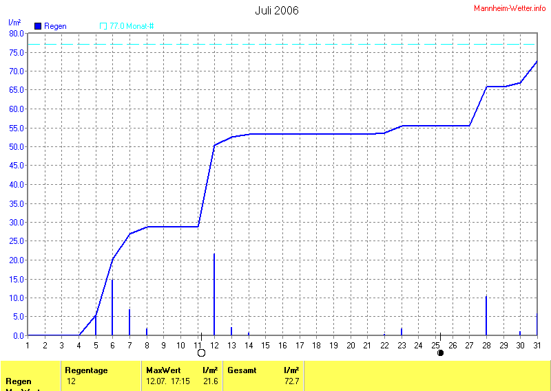 Die gesamte Regenmenge lag bei 72.7l/m² (entspricht: 94.4%) und war damit um -4.3l/m² vom langjährigen Wert entfernt. Niederschlag gab es an 12Tagen. Mehr als 2mm Regen gab es an 7Tagen. Sehr viel Regen mit mehr als 20mm pro Tag gab es an 1Tagen.
