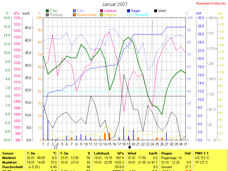 Der wärmste Tag war der 19.01.2007 um 14:05 mit 15.9°C. Am kältesten war es mit -8.9°C am 26.01.2007 um 08:05.