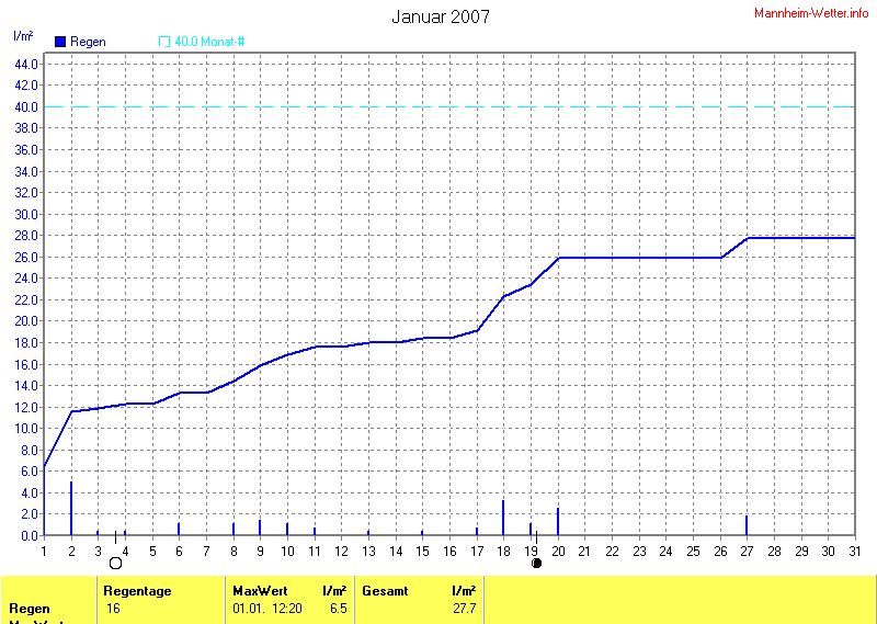 Die gesamte Regenmenge lag bei 27.7l/m² (entspricht: 69.3%) und war damit um -12.3l/m² vom langjährigen Wert entfernt. Niederschlag gab es an 16Tagen. Mehr als 2mm Regen gab es an 4Tagen. Sehr viel Regen mit mehr als 20mm pro Tag gab es an 0Tagen.