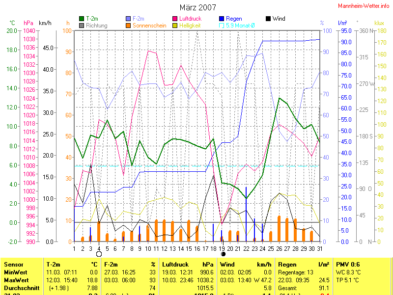 Der wärmste Tag war der 12.03.2007 um 15:40 mit 18.8°C. Am kältesten war es mit 0.0°C am 11.03.2007 um 07:11.