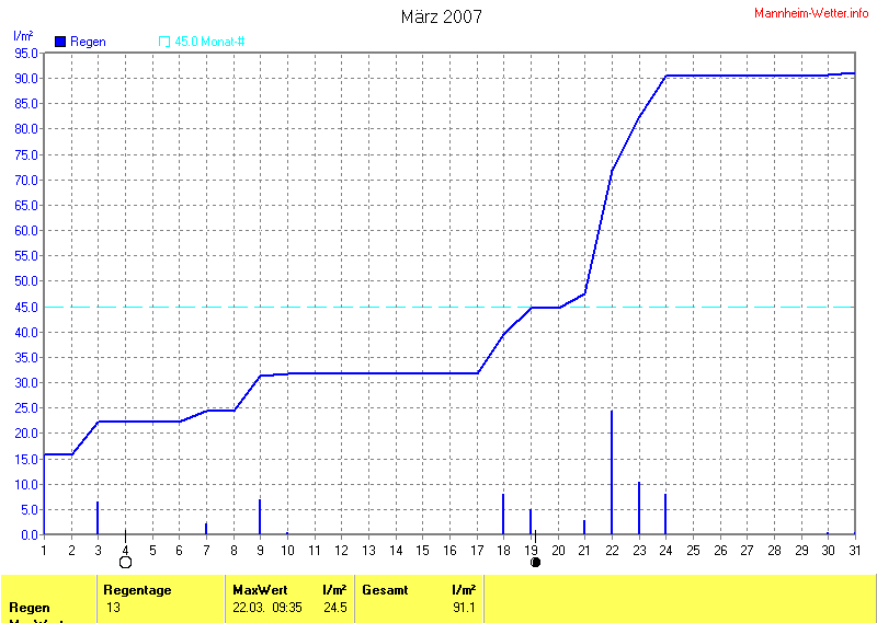 Die gesamte Regenmenge lag bei 91.1l/m² (entspricht: 202.4%) und war damit um +46.1l/m² vom langjährigen Wert entfernt. Niederschlag gab es an 13Tagen. Mehr als 2mm Regen gab es an 10Tagen. Sehr viel Regen mit mehr als 20mm pro Tag gab es an 1Tagen.