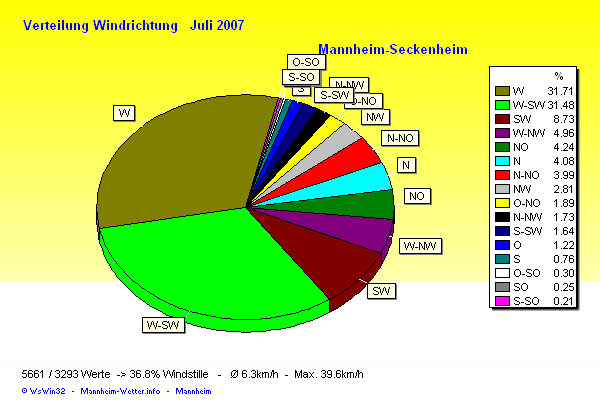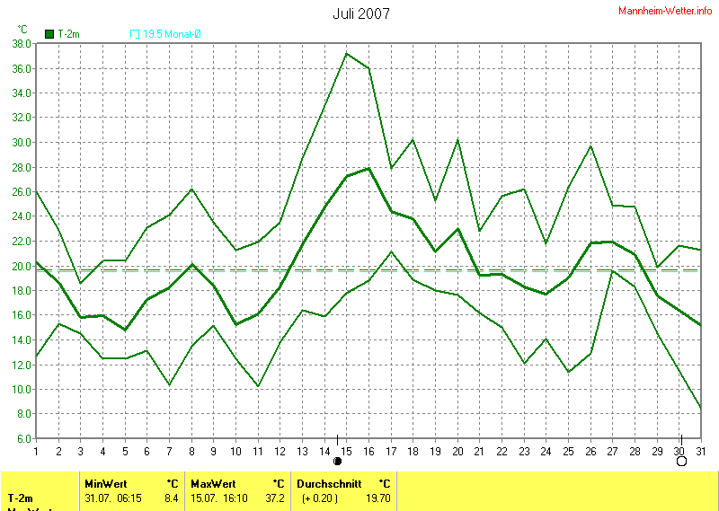 Der wärmste Tag war der 15.07.2007 um 16:10 mit 37.2°C. Am kältesten war es mit 8.4°C am 31.07.2007 um 06:15.
