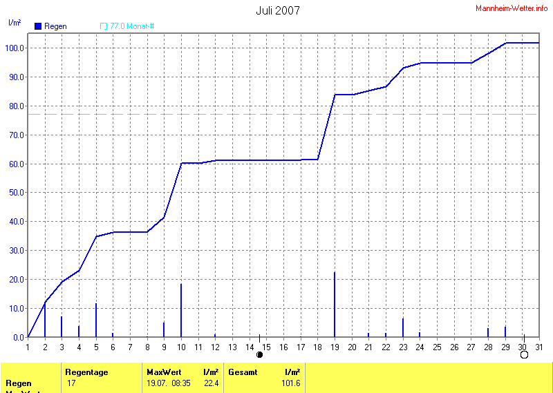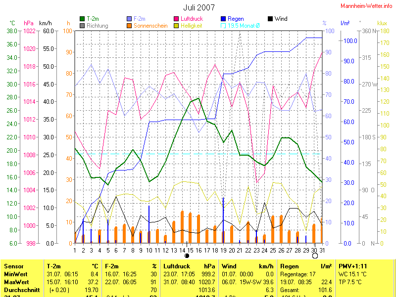 Die Durchschnittstemperatur für den Monat Juli 2007 lag bei 19.70°C. Die Abweichung vom langjährigen Mittel war +0.20°C.