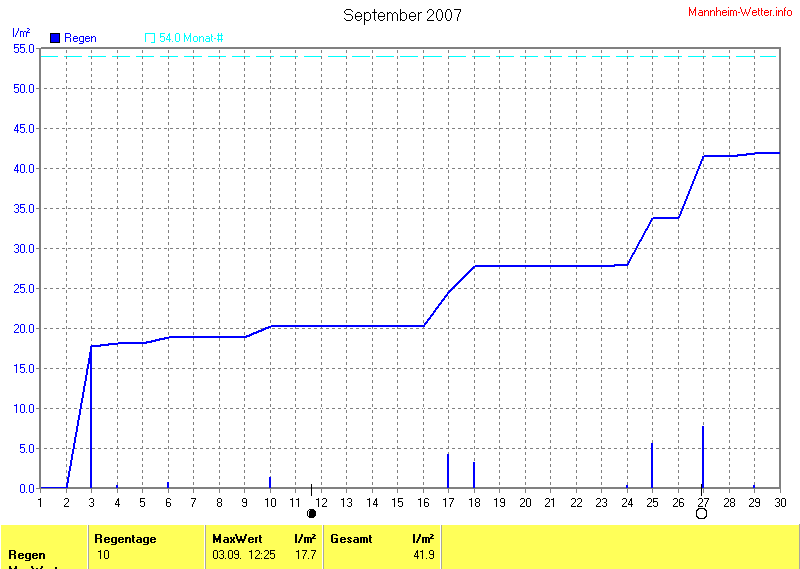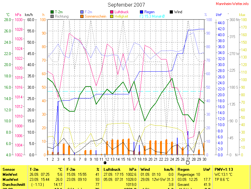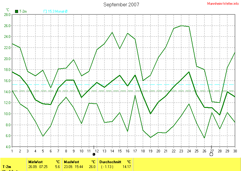 Die Durchschnittstemperatur für den Monat September 2007 lag bei 14.17°C. Die Abweichung vom langjährigen Mittel war -1.13°C.