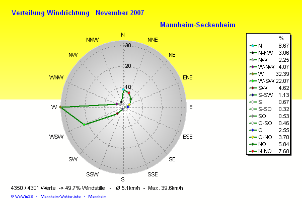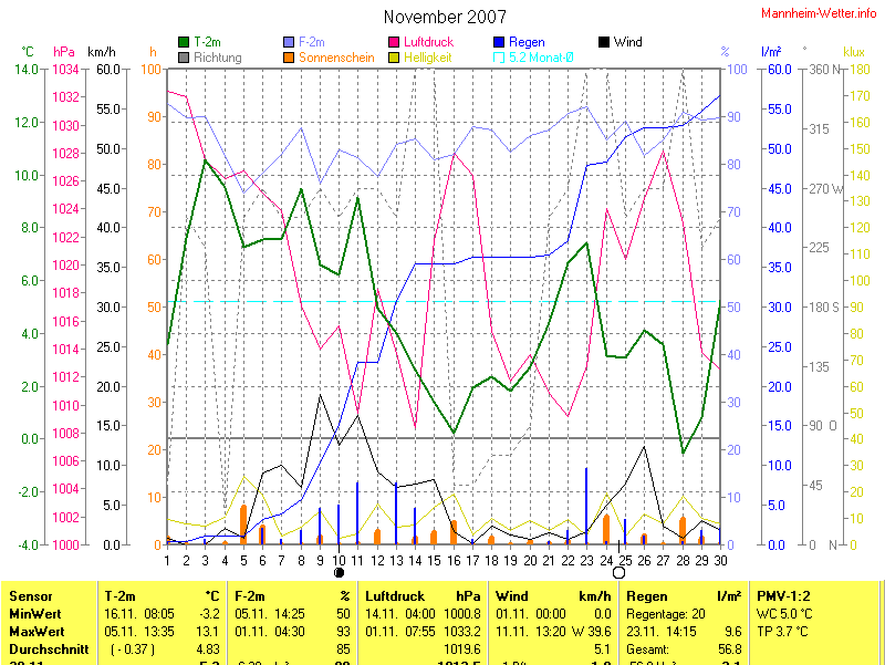 Die Durchschnittstemperatur für den Monat November 2007 lag bei 4.83°C. Die Abweichung vom langjährigen Mittel war -0.37°C.