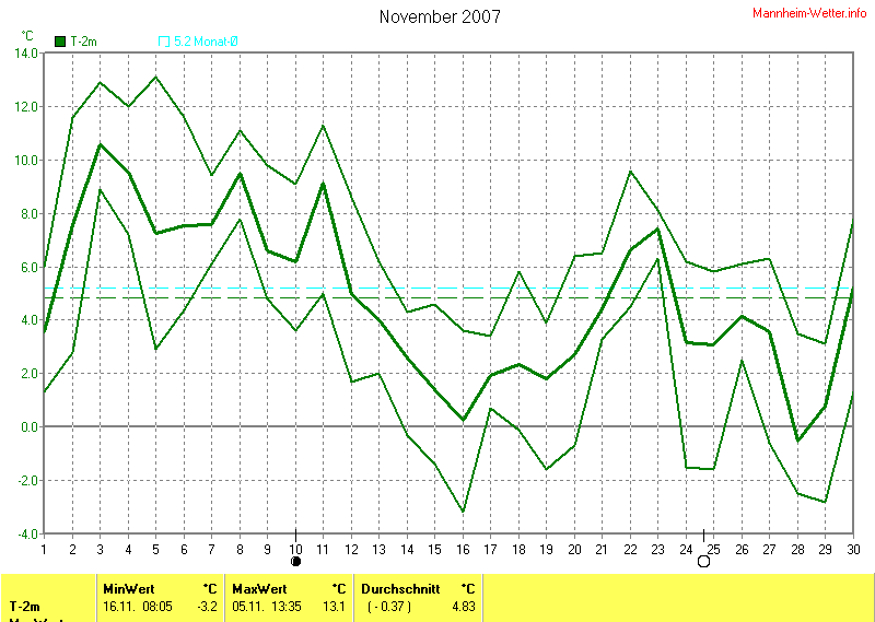 Der wärmste Tag war der 05.11.2007 um 13:35 mit 13.1°C. Am kältesten war es mit -3.2°C am 16.11.2007 um 08:05.