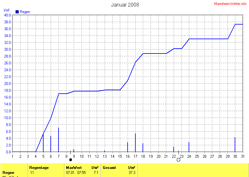 Dargestellt wird die grafische Übersicht für den Niederschlag. Zu sehen sind immer die täglichen Niederschlagsmengen (von 0-24 Uhr) und in der ansteigenden Linie die Summe aller Niederschläge:
