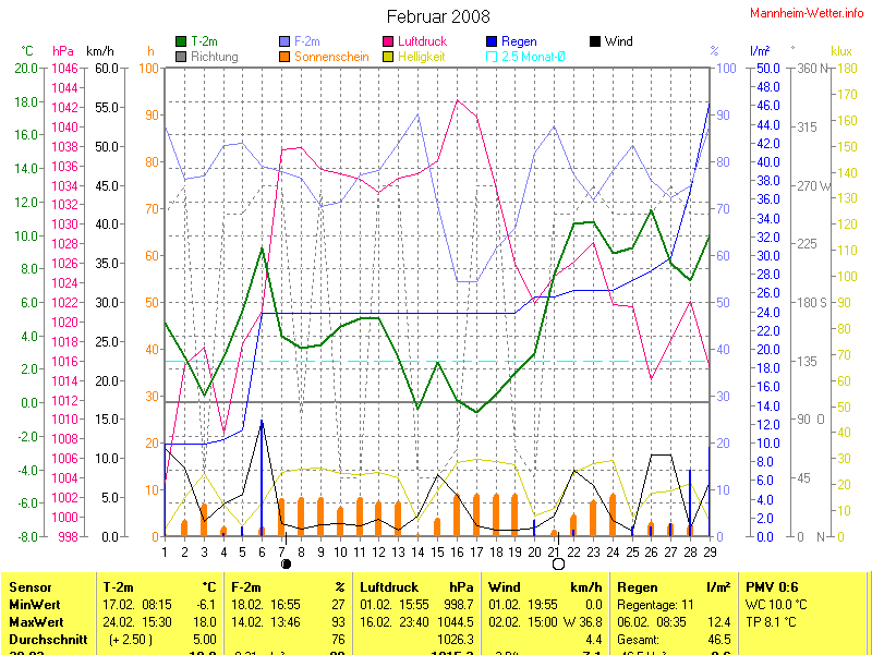 Die Durchschnittstemperatur für den Monat Februar 2008 lag bei 5.00°C. Die Abweichung vom langjährigen Mittel war +2.50°C.