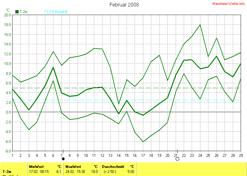Der wärmste Tag war der 24.02.2008 um 15:30 mit 18.0°C. Am kältesten war es mit -6.1°C am 17.02.2008 um 08:15.