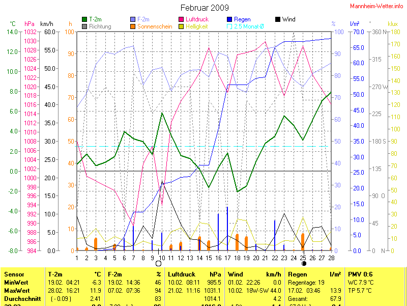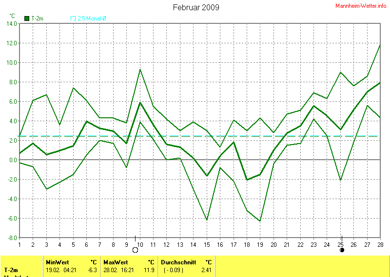 Der wärmste Tag war der 28.02.2009 um 16:21 mit 11.9°C. Am kältesten war es mit -6.3°C am 19.02.2009 um 04:21.