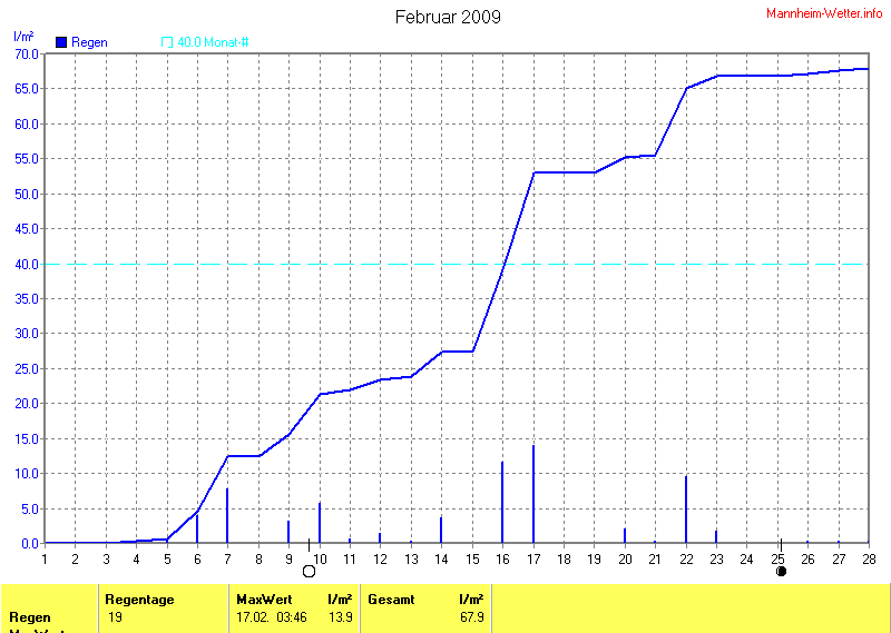 Die gesamte Regenmenge lag bei 67.9l/m² (entspricht: 169.8%) und war damit um +27.9l/m² vom langjährigen Wert entfernt. Niederschlag gab es an 19Tagen. Mehr als 2mm Regen gab es an 9Tagen. Sehr viel Regen mit mehr als 20mm pro Tag gab es an 0Tagen.