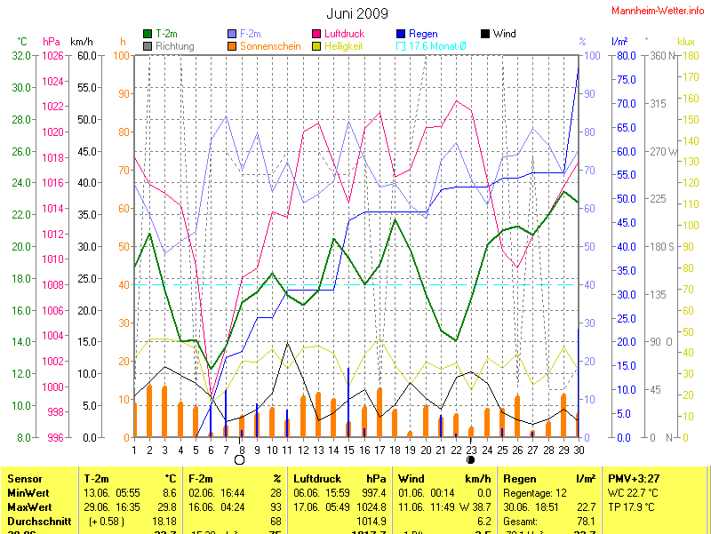 Die Durchschnittstemperatur für den Monat Juni 2009 lag bei 18.17°C. Die Abweichung vom langjährigen Mittel war +0.57°C.