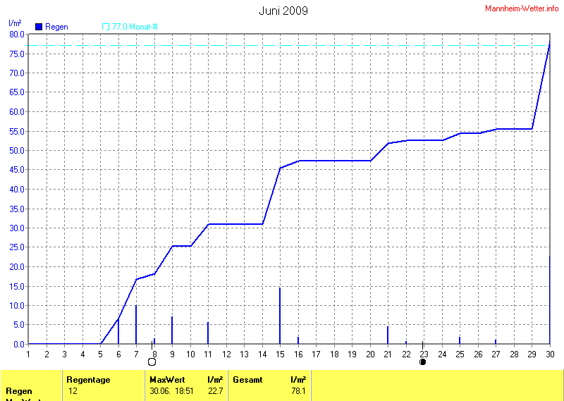 Die gesamte Regenmenge lag bei 78.1l/m² (entspricht: 101.4%) und war damit um +1.1l/m² vom langjährigen Wert entfernt. Niederschlag gab es an 12Tagen. Mehr als 2mm Regen gab es an 7Tagen. Sehr viel Regen mit mehr als 20mm pro Tag gab es an 1Tagen.